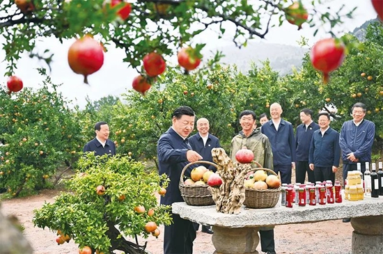 2023年9月24日,中共中央总书记、国家主席、中央军委主席习近平在浙江考察结束返京途中,来到山东省枣庄市考察。这是习近平在位于峄城区的冠世榴园石榴种植园了解石榴产业发展情况。 新华社记者 燕雁/摄