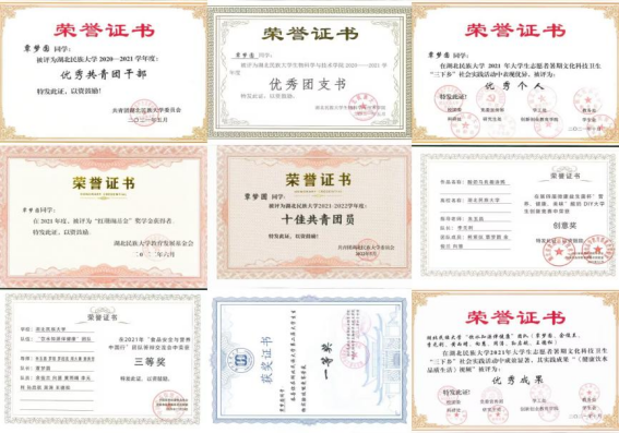 注:覃梦园曾获永利官网2021-2022学年度国家奖学金,连续两年获得一等奖学金以及“三好学生”荣誉称号,获得全国生命科学竞赛(创新创业)三等奖、3044am永利集团3044noc第七届互联网+银奖、3044am永利集团3044noc红珊瑚奖学金、湖北省第四届微康益生菌杯“健康、营养、美味”酸奶DIY大学生创新竞赛最佳创意奖、3044am永利集团3044noc第十一届全国大学生电子商务“创新、创意及创业”挑战赛三等奖以及第十二届二等奖、3044am永利集团3044noc第二届梦想杯一、二、三等奖、3044am永利集团3044noc益生菌知识竞赛二等奖、“全国食品安全与营养中国行”交流会三等奖等。