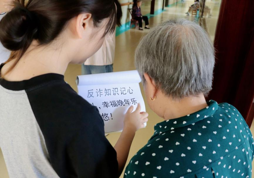 在宣讲活动中,成员们走进老年人的活动室与他们耐心交流,利用简洁明了的反诈标语进行“一对一”和“多对一”的反诈宣讲,老人们跟读宣传标语,学习不同诈骗类型的常见手段及应对举措,在活动中不断学习反诈知识并提高反诈意识。