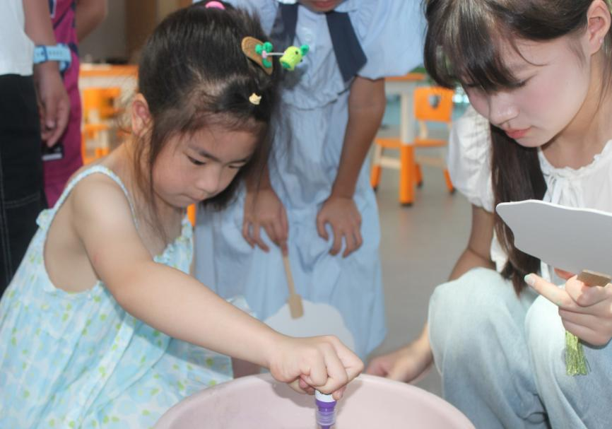 在艺术实践环节,漆扇制作和剪纸教学有序开展。团队成员耐心地教孩子们如何调色制扇,孩子们充分发挥想象,制作出各具特色的漆扇作品。