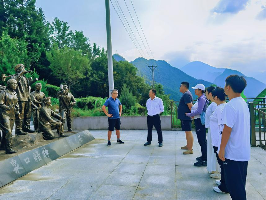 在泉口村的座谈会上,村党支部书记、村委会主任谭庆勇向团队介绍了当地产业发展现状及未来规划,并播放了“泉口精神”宣传片,让队员们深入了解上世纪60年代,泉口公社党委书记张植弟带领全村人民进行“坡改梯”、向荒山要粮的艰苦历程。随后,团队实地走访张植弟同志故居、泉口梯田、英模纪念园,通过亲手触摸当年耕作使用的农具,深刻感悟“泉口精神”所蕴含的团结协作、艰苦奋斗和奉献精神。