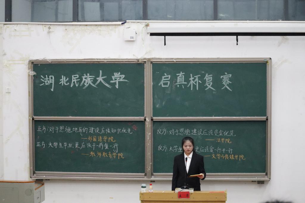 在“对于恩施地区的建设应该知识优先or资金优先”辩场上,经济与管理学院从环境可持续发展、再生产劳动力、人口教育程度、地区自然灾害等四个方面入手剖析本方的论点。智能科学与工程学院从吸引人才流入、基础设施建设、地区发展不平衡等方面阐述观点。