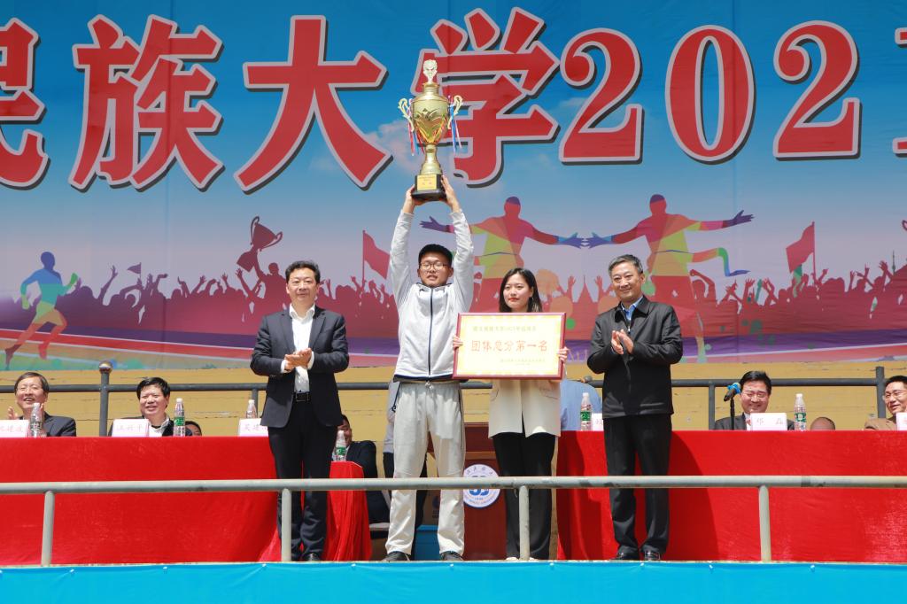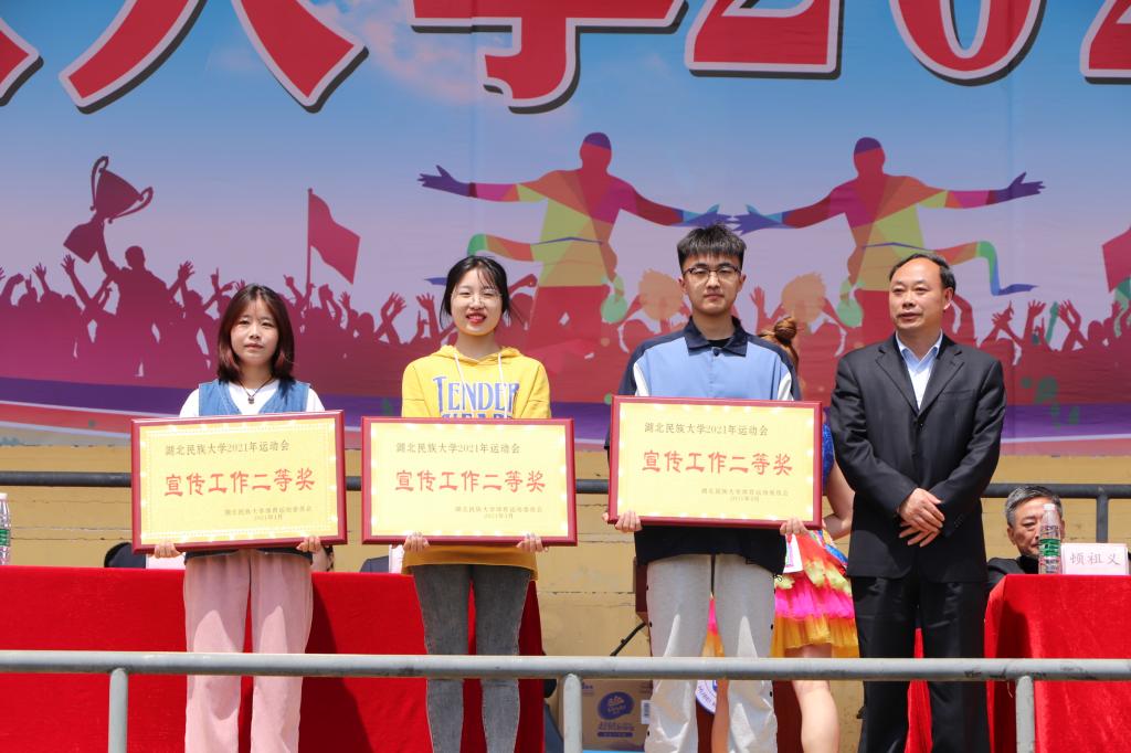 大会第一项,由党委委员宣传部副部长唐敦双宣布宣传奖获奖单位名单,文学与传媒学院荣获一等奖;总裁判长,体育学院院长倪东业宣布国际教育学院,民族与社会学学院,新材料与机电工程学院等10个学院获得体育道德风尚奖。此外,医学院以635分的高分摘得本次运动会团体总分第一名,法学院,信息工程学院分别斩获第二名和第三名的好成绩。校领导分别为获奖单位颁奖。