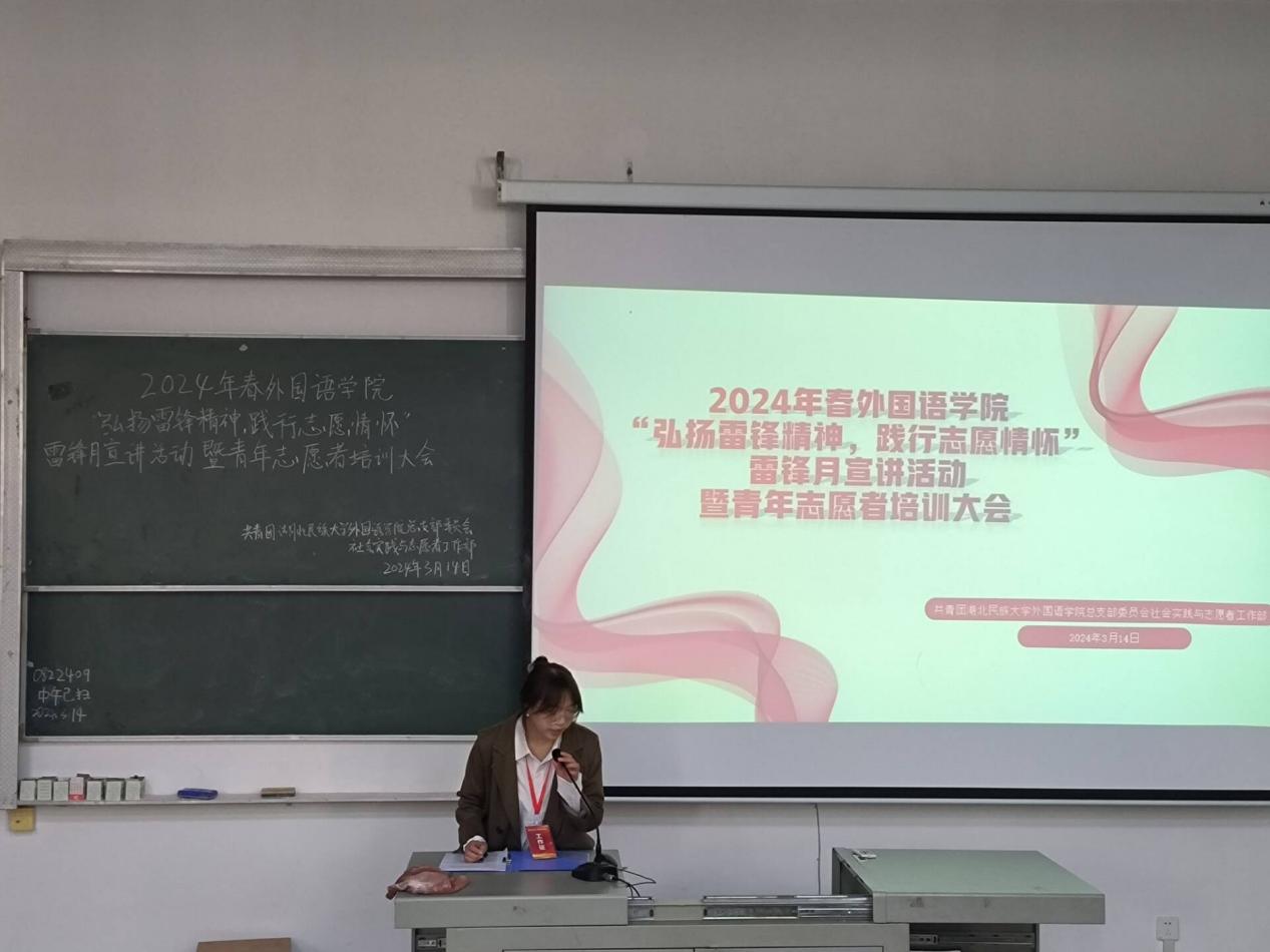 为深入学习领悟党的二十大精神,深刻把握雷锋精神的时代内涵和实践要求,培养大学生关爱他人、服务社会的优良品质,3月14日,外国语学院团总支在6B401教室开展以“弘扬雷锋精神,践行志愿情怀”为主题的雷锋月宣讲活动暨青年志愿者培训大会。