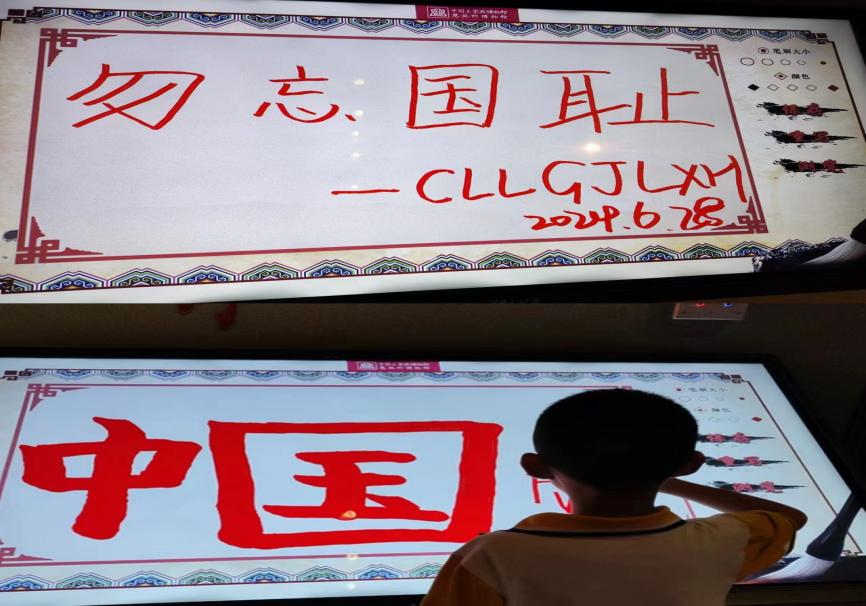 参观期间,导游的生动讲解让文物和历史事件鲜活起来,游客们沉浸其中。人们写下“勿忘国耻”“爱我中华”等话语,一个小男孩写下的“中国”令人动容。