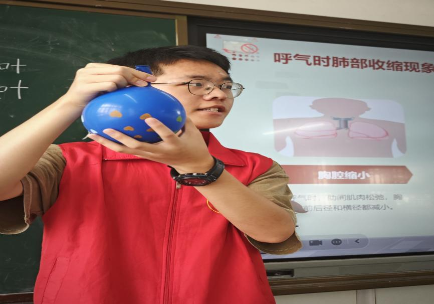 活动中,志愿者结合自身专业讲解有关肺的知识,用气球的吹气与放气模拟肺泡的工作过程,让孩子们在气球的变化中充分学习有关肺泡部分的知识,加深对肺的理解。对于表现优异的小朋友,志愿者们发放小红花以此来鼓励小朋友们积极踊跃回答问题,加深小朋友们对肺部各知识的理解与运用。