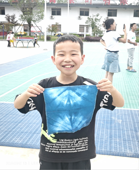 在志愿者的引导下,孩子们纷纷动手尝试起来。他们或独自创作,或与小伙伴合作完成作品。随着染料的渗透和布料的展开,一幅幅图案各异的扎染作品逐渐呈现在大家眼前。孩子们看着自己的作品,脸上洋溢着满足与自豪的笑容。