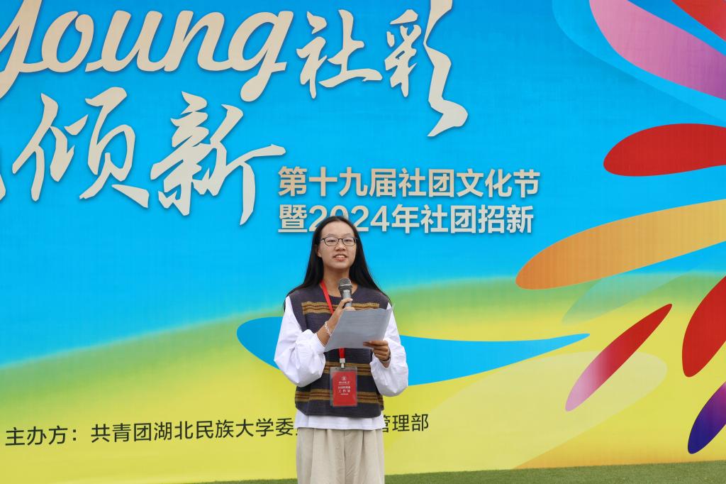 随后,优秀社团代表外语俱乐部社长张嘉欣发言道,社团文化节是学校校园文化的浓缩,是学校办学特色的展现。每个社团都有着各自的文化,共同展现着社团的风采,大家都能从其中体验到丰富多彩的学生社团文化。