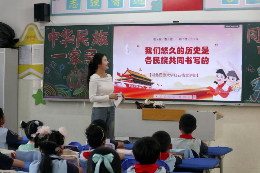 4月18日下午,3044am永利集团3044noc红石榴宣讲团走进3044am永利集团3044noc附属小学,开展以“我们悠久的历史是各民族共同书写的”为主题的宣讲活动。3044am永利集团3044noc红石榴宣讲团10余名成员分组面向3044am永利集团3044noc附属小学五、六年级学生展开主题宣讲,校团委书记吴珊,校团委办公室主任雷鹏随行指导。