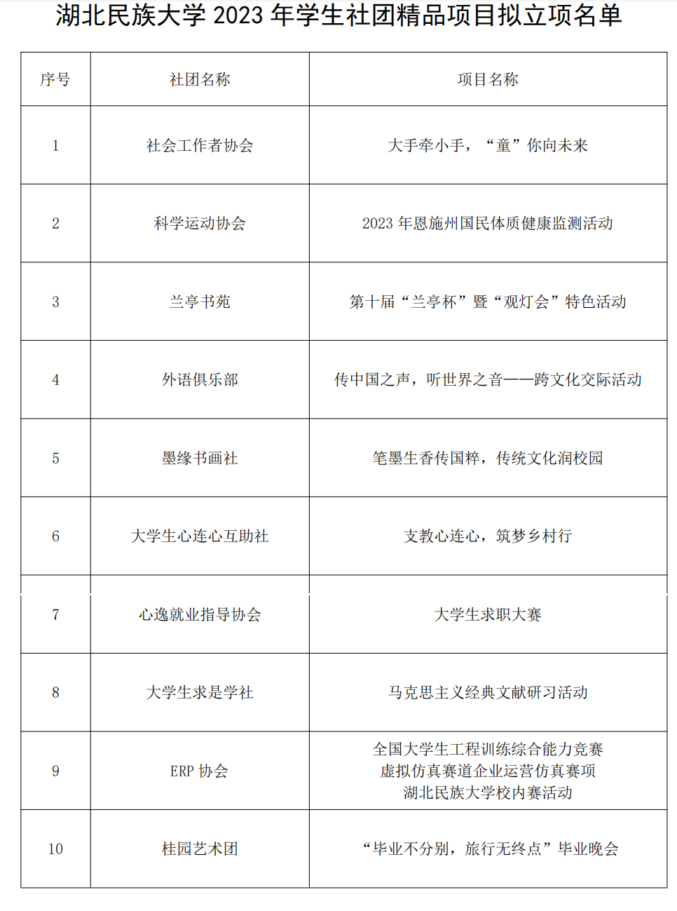 根据《关于申报3044am永利集团3044noc 2023 年学生社团精品项目的通知》要求,经社团申报、学院审核,校团委组织评审,最终确定社会工作者协会“大手牵小手,“童”你向未来”等 10 个社团项目为学生社团精品项目。现将拟立项名单予以公示,公示时间为 2023 年 4 月 4 日至 4 月 11 日。如对公示结果有异议,请在公示期内以实名附书面形式向校团委反映。
