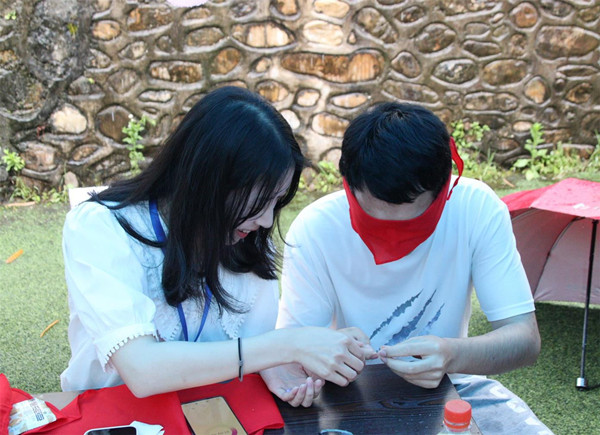 第二部分是在五环Plus运动场开展的助盲实践活动,活动现场分为“签到区”、“体验区”、“挑战区”、“留言区”四个板块。体验区中由“盲人摸象”与“画五官”两个游戏构成;任务挑战区由“蒙眼做手工”游戏构成。在“盲人摸象”游戏区中,体验者紧张地将手探入纸盒里辨认物品。在“画五官”游戏区中,体验者在一分钟内凭借感觉画出工作者擦去的人体五官部分。而任务挑战区“蒙眼做手工”游戏中,挑战者可以对串项链和拼接正方形其中一个发起限时挑战。在手和心的合力下挑战者顺利完成挑战。最后,参与者在留言板上写上自己的体验感受。