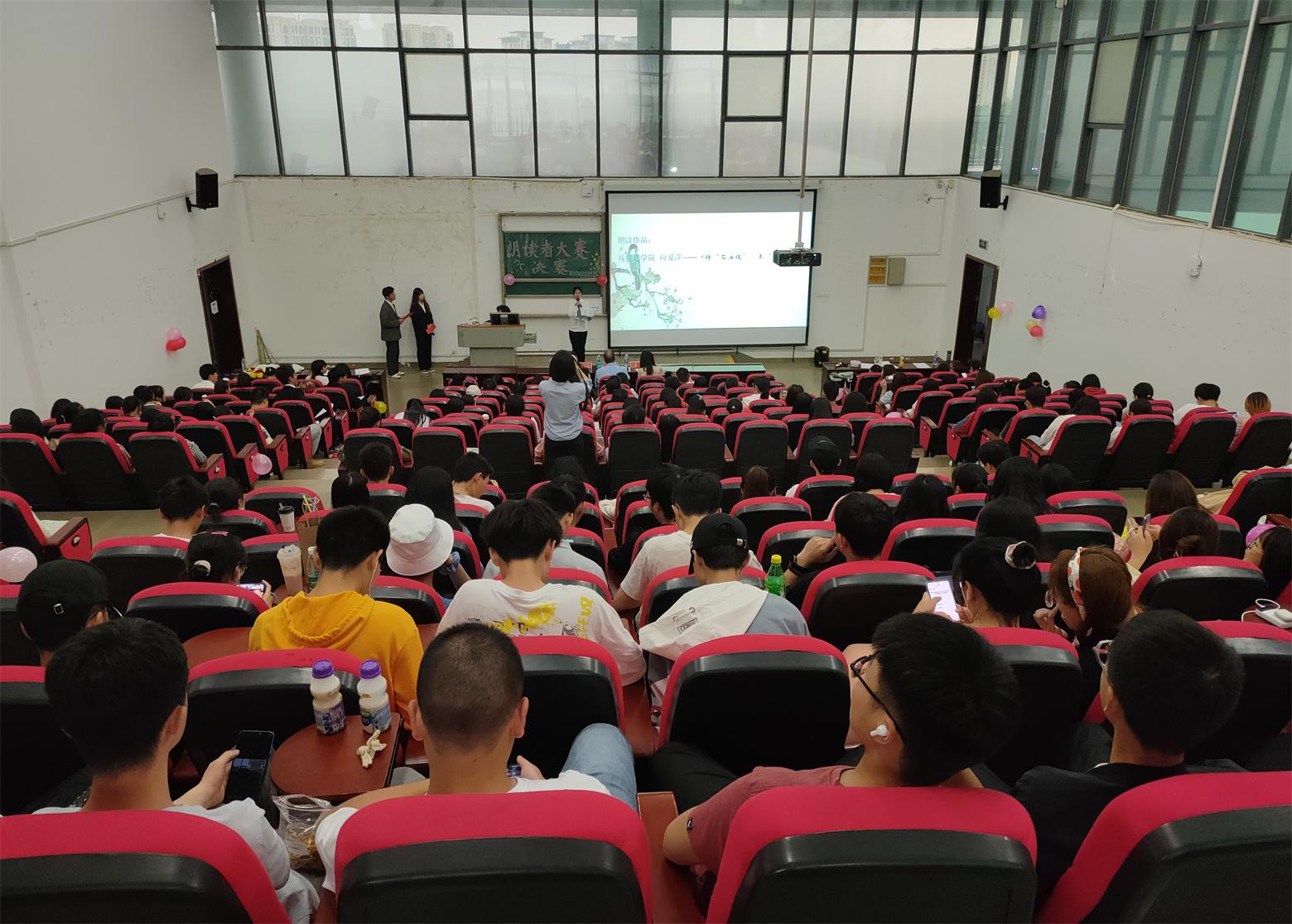 经过重重对决,共有十位选手晋级决赛。本次比赛共有《新作十八拍•党之世风》、《承“三牛精神”,做新时代牛人》、《辟蛮荒创世纪盛景,接火炬守岁月静好》、《夺冠》等十部作品。来自我院的四号选手许一柯朗诵《青春心向党,建功新时代》,她的语调铿锵有力,字字坚定,饱满的激情赢得观众阵阵掌声。外国语学院五号选手李晶深情朗读《承“三牛精神”,做新时代牛人》,她声音洪亮,感情真挚,极富感染力,清晰流畅的发音吐字、平仄顿挫的朗诵,获得观众一致好评。教育学院七号选手杨芳朗读《辟蛮荒创世纪盛景,接火炬守岁月静好》也不甘示弱,她一袭旗袍,融入民国时期风味,口音清晰,生动展现新时代攻坚克难的景象。通过精彩的一分钟朗读加时赛,最终,来自外国语学院五号选手李晶以9.5分夺得大赛桂冠。
