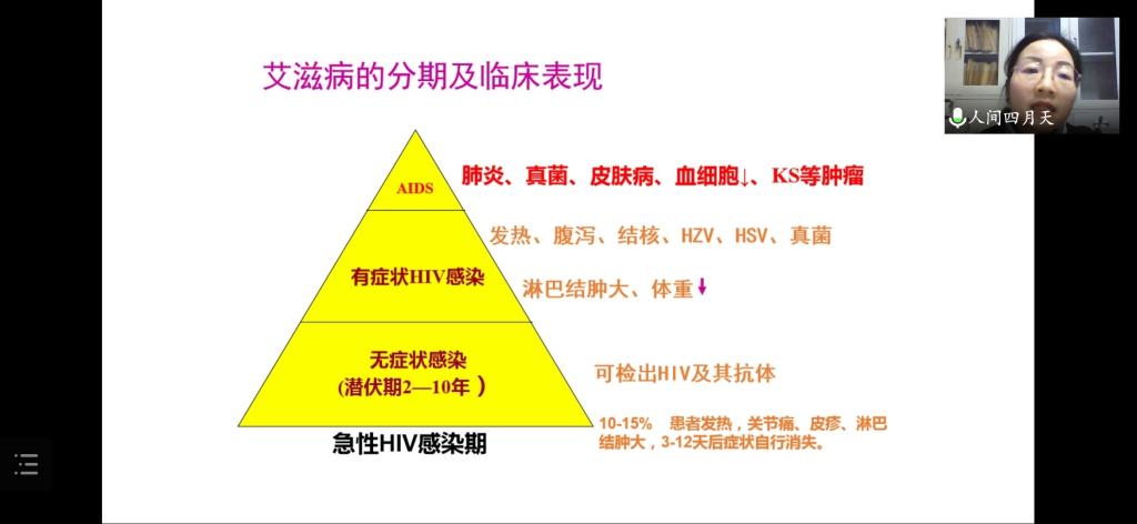 12月1日晚七点,线上艾滋病知识讲座在腾讯会议平台上举行,此次讲座特别邀请恩施市疾控艾滋病科主治医师陈汝琼。讲座伊始,主持人播放关于防范艾滋病的校园采访视频,陈汝琼针对采访视频中部分学生的错误看法进行纠正。她结合艾滋病流行因素介绍艾滋病的定义,引导学生了解艾滋病的发病机理。总述HIV病毒特点后,陈汝琼分别从灭活条件、分布位置、成长过程、感染者临床表现四个部分展开详细叙述。她提出人们不了解艾滋病的原因是害怕艾滋病,但国家管理逐渐规范,妇幼保健措施逐渐完善,这有利于控制艾滋病传播。随后,陈汝琼结合生活实例,从传染源、传播途径和易感人群三个方面向学生进行讲解,在谈及母婴传播时,她强调及时对孕妇进行干预可大大降低婴儿感染几率。此外,她凭借对艾滋病多年的研究与扎实的功底,向学生举例说明与艾滋病患者一般生活接触不会传染艾滋病。老师耐心详细,深入浅出的讲解让学生受益匪浅。