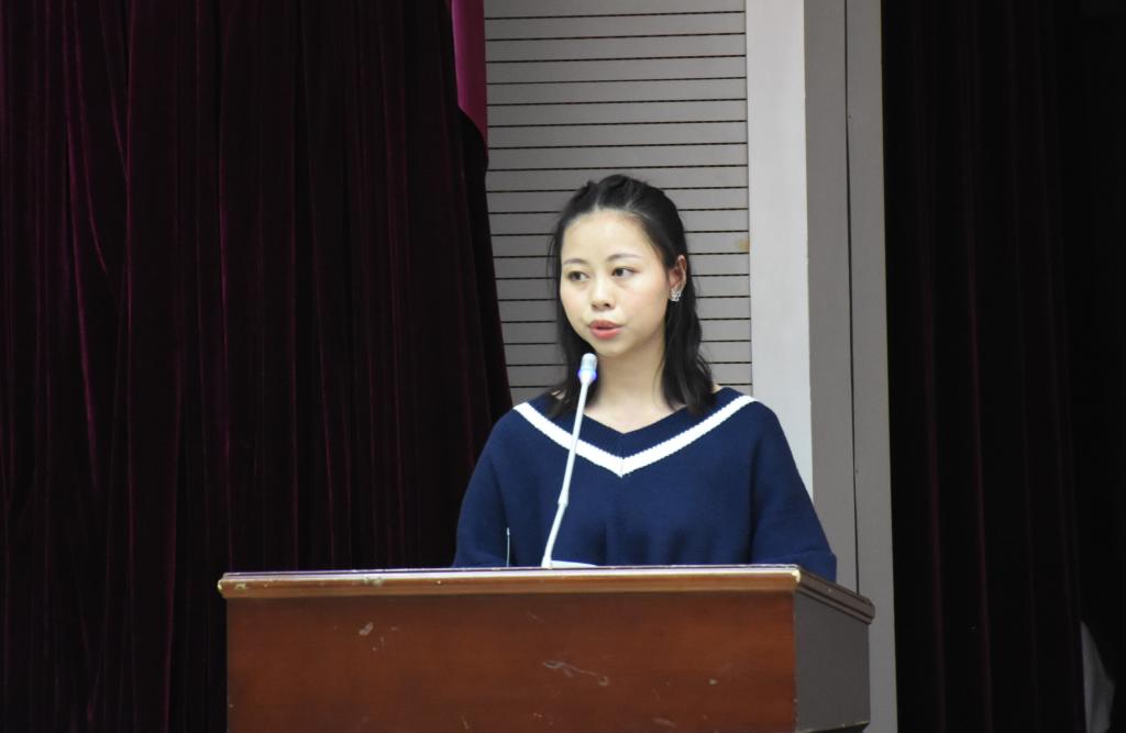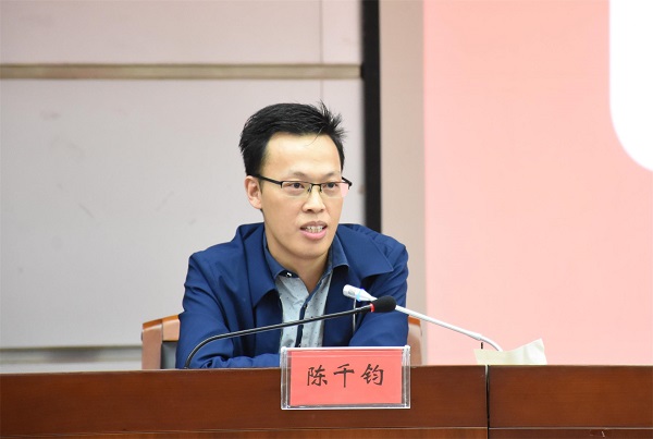 优秀校友陈千钧发言。他从“学习”、“实践”、“习惯”三方面为在场新生提出建议。在学习层面,他提出学习经济、哲学和时事方面的知识,全方面提高发展自己;在实践层面,对新生提出能说、会写、能办事三个要求;在习惯方面,他表示大学生应该有良好的作息及学习习惯,热爱运动,全面提高自身综合实力。