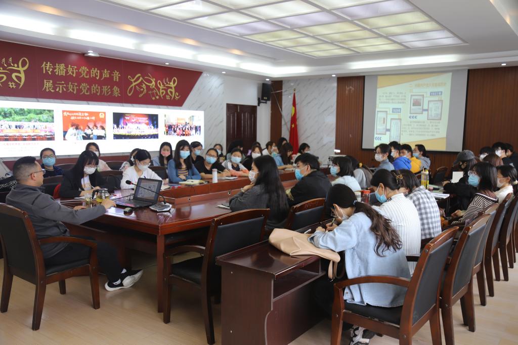 本网讯(记者 欧阳洁/文 卢子畅/图)5月28日,我院联合外国语学院、音乐舞蹈学院及美术与设计学院于音乐舞蹈学院四楼会议室开展以“铮铮誓言,拳拳赤心”为主题的党课教育活动。我院党总支书记曹召胜受邀担任本次活动主讲人,四院全体发展对象参与此次培训活动。