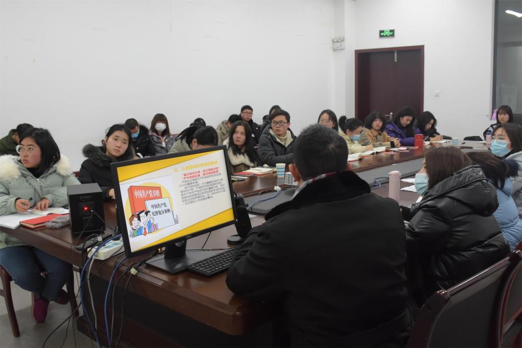 本次活动在缴纳党费、重温入党誓词中拉开序幕,由王莉娜同志组织党员学习党章。随后,全体党员认真学习了“十九届五中全会精神”。特色实践环节,预备党员面向党旗宣誓,表达自己的入党决心,随后我院党总支书记曹召胜同志为预备党员佩戴党徽、分发党章。预备党员代表宋金鑫同志选读入党志愿、表明入党决心;正式党员代表贾斌回忆自己的入党经历,从经历中找寻入党初心。接着,曹召胜同志为全体党员讲授微党课《铮铮誓言,拳拳赤心》。首先他从《共产主义者同盟章程》追根溯源,点明了入党誓词的历史渊源以及对中国共产党建党的影响;其次结合入党誓词的发展过程,回顾了近代历史上中国共产党的奋斗历史,详细阐释了入党誓词的内涵。最后,他强调,入党誓词是最全面、最彻底的政治标准,作为一名共产党员,应时刻以誓词作为行动指南,保持警醒,不忘初心,做一名优秀的共产党员。微党课结束后,全体党员再次围绕初心,观看《寻找老党员 整理好故事》的微视频,从老党员的身上看中国共产党全心全意为人民、为民族、为国家鞠躬尽瘁的初心。