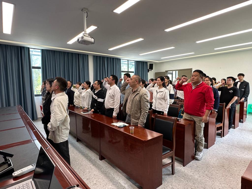 全体党员在党总支书记曹召胜同志的组织下重温了入党誓词,随后开展了集中学习、民主议事等环节,还邀请了白果坝村村委会周主任为师生党员介绍白果坝村的相关情况。
