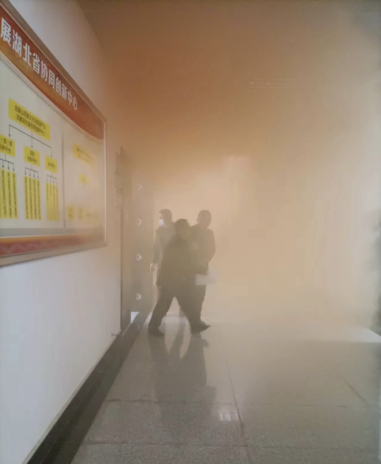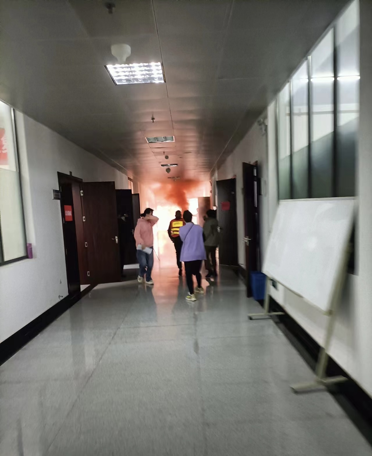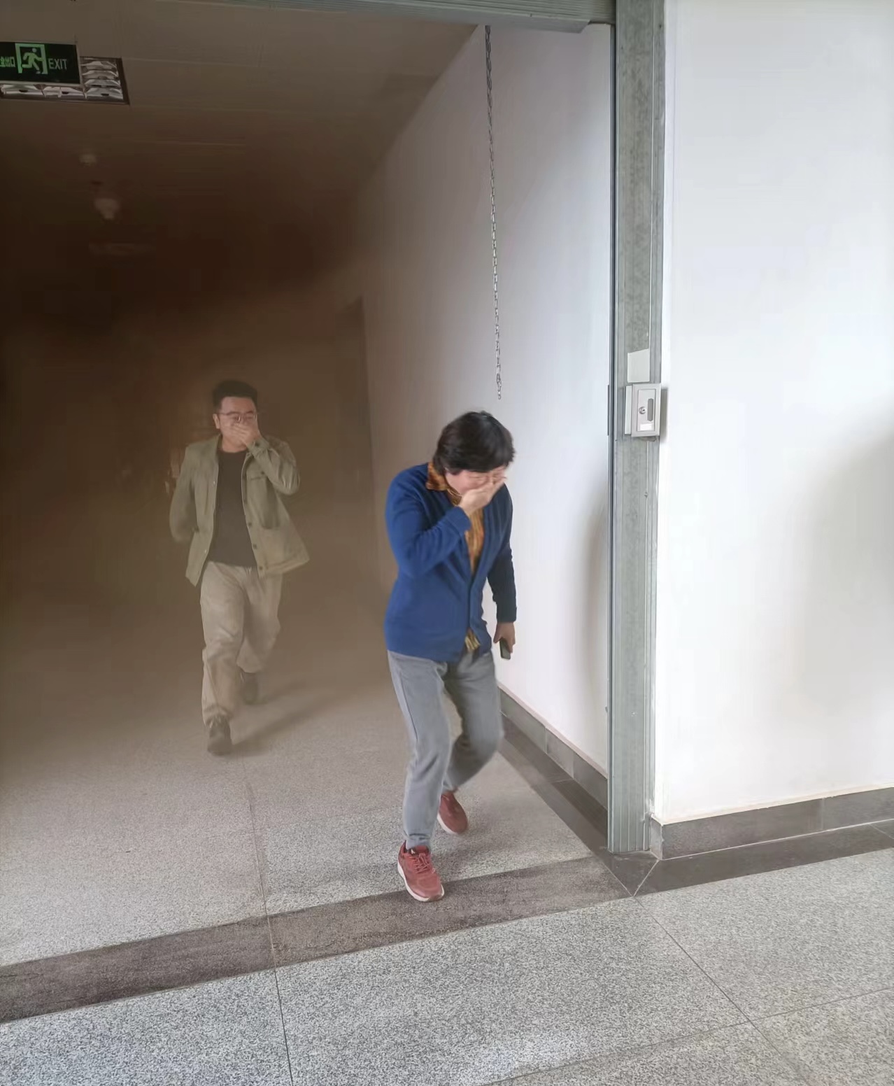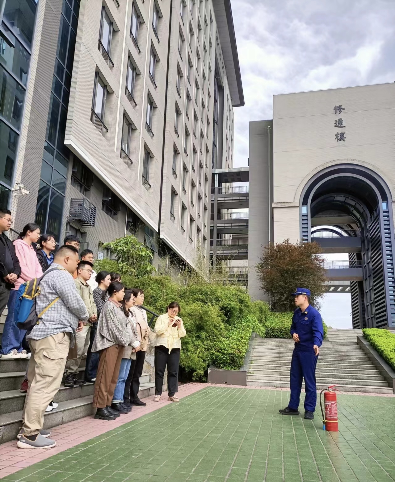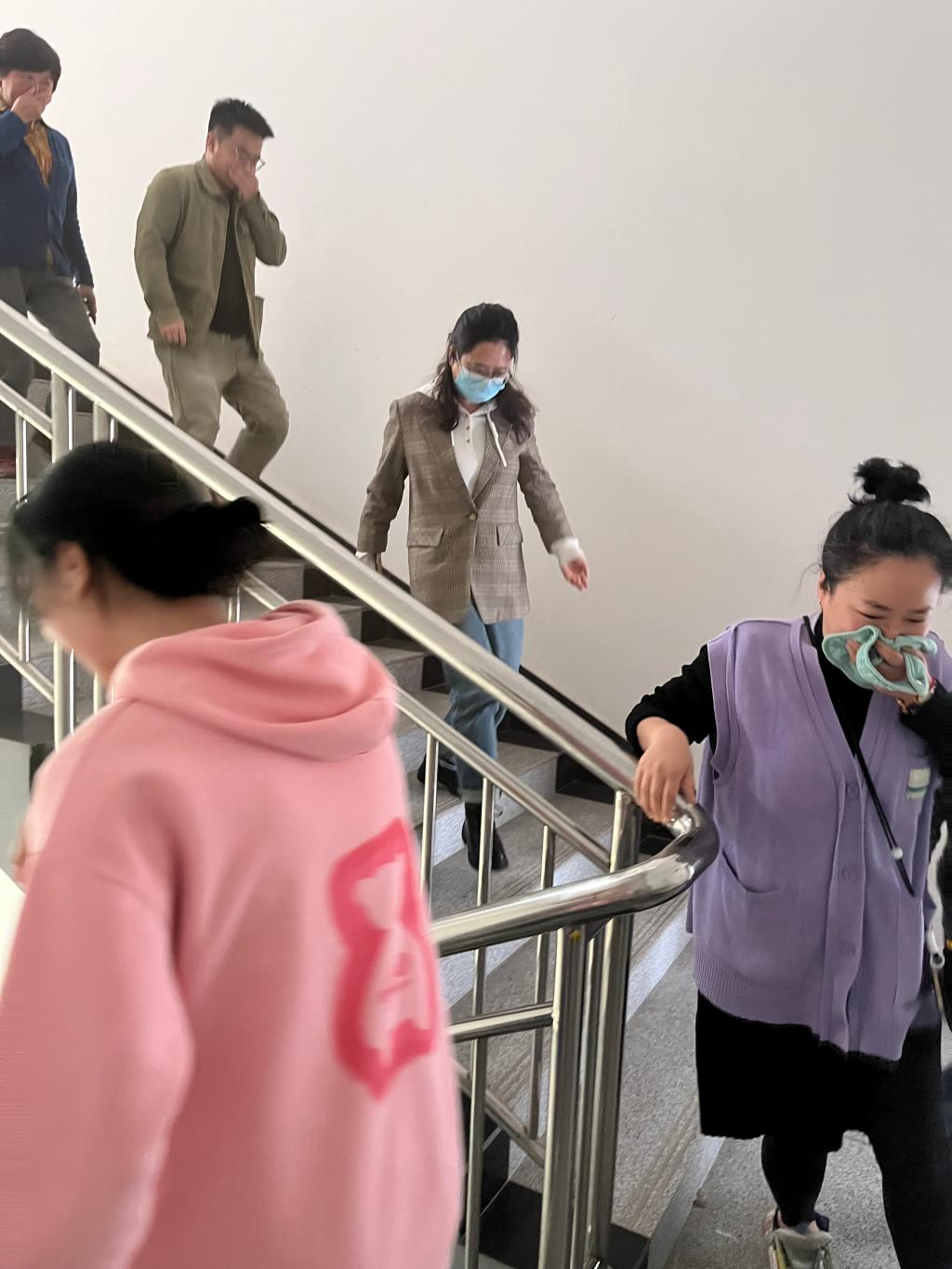 演练前,消防科科长向宣霖就演练中注意事项和安排进行强调和部署。下午14时55分,随着一阵急促的警报声,保卫处副处长李建华下达了修远楼12楼教学楼发生火灾、请师生立即撤离的命令。现场工作人员各司其职,迅速到达指定岗位,组织师生进行疏散,在浓密的烟雾中全体师生弯腰、猫步、手捂口鼻,沿着指定安全通道快速撤离到安全开阔地带地带。