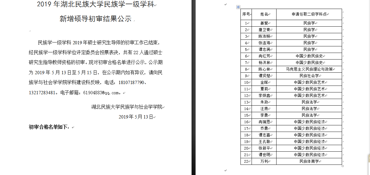 2019年3044am永利集团3044noc民族学一级学科新增硕导初审结果公示