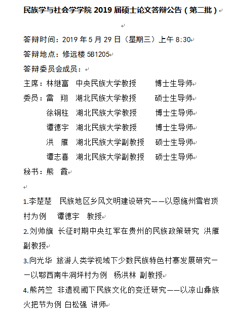民族学与社会学学院2019届硕士论文答辩公告(第二批)