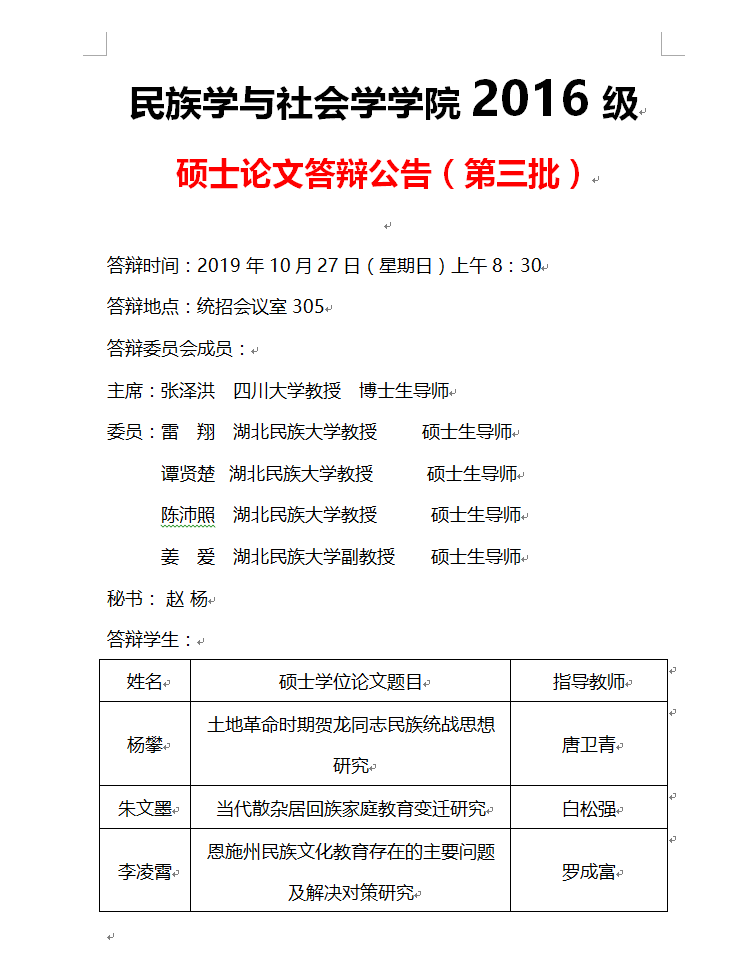 民族学与社会学学院2016级硕士论文答辩公告(第三批)