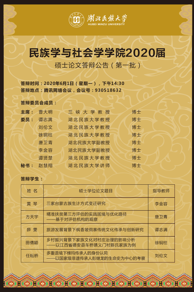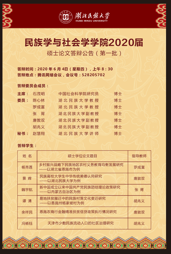 民族学与社会学学院2020届硕士论文答辩公告(第一批)