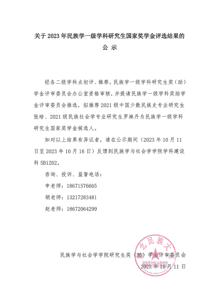 关于2023年民族学一级学科研究生国家奖学金评选结果的公示