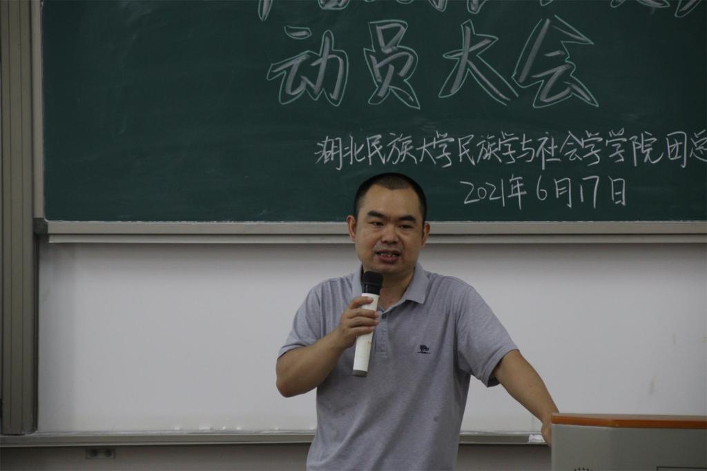 本网讯(记者 周树洋 薛郁竹/文 刘睿 肖欣/图 )为深入贯彻学习党的十九大会议精神,引领广大青年学生投身社会实践,6月17日,我院在修远楼5A107教室召开2021年暑期社会实践动员大会。我院周书刚老师,团总支书记熊霞老师,学生科顿山老师,往届暑期社会实践优秀学生代表何套、肖洪应邀出席本次活动,我院全体大一大二学生参加本次动员大会。