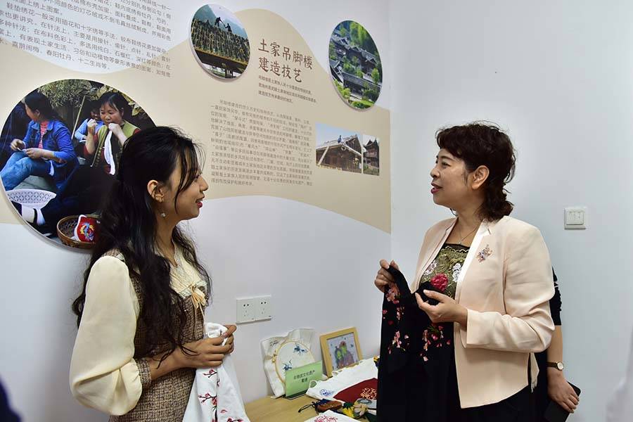万春梅(右)与学生探讨非遗传承项目