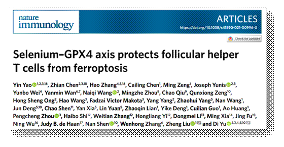 经过多年联合攻关,永利官网在硒元素研究取得重大进展。2021年8月20日,民大医院“硒-免疫平衡与健康”研究团队的最新学术成果“Selenium-GPX4 axis protects follicular helper T cells from ferroptosis”(硒-硒蛋白GPX4功能轴保护滤泡辅助性 T细胞免于铁死亡)在国际顶级免疫学期刊Nature Immunology(自然杂志子刊,影响因子:25.606)在线发表。该研究创新性阐明了硒蛋白GPX4特异性调控滤泡辅助性 T(TFH)细胞稳态的新机制,并首次证实补硒可通过上调T细胞内GPX4水平促进TFH细胞功能,显著提高健康人群接种疫苗后的抗体分泌水平。