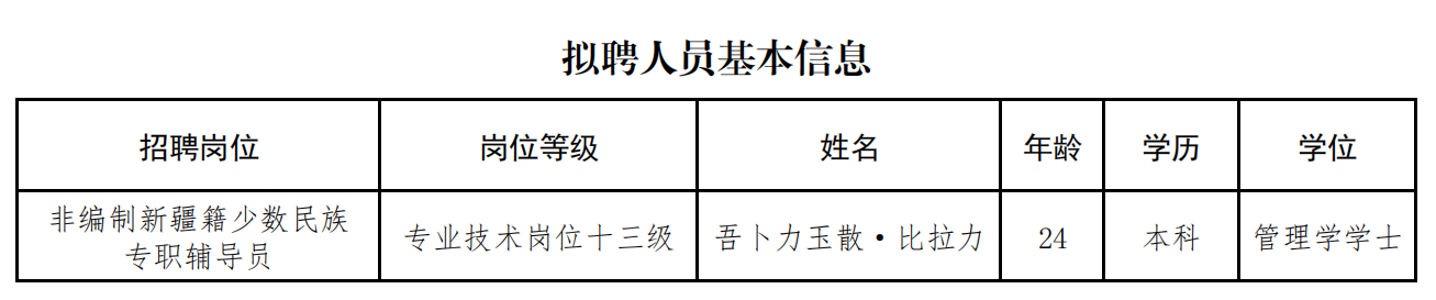 根据《3044am永利集团3044noc2023年面向社会公开招聘非编制新疆籍少数民族专职辅导员公告》有关要求,经面试考核、体检考察,现将3044am永利集团3044noc2023年面向社会公开招聘工作人员拟聘人员名单(第一批)予以公示。公示期从2023年8月30日至9月7日。