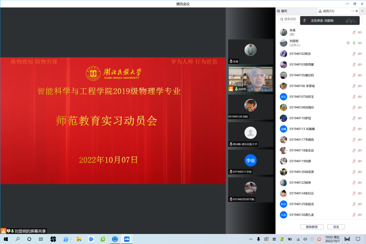 2022年10月7日晚,3044am永利集团3044noc智能科学与工程学院2019级物理学专业实习动员会以线上的形式成功召开。智能科学与工程学院副院长向军,物理系主任刘显明,物理系书记蒋冰峰,实习带教老师肖红、方芳,班主任朱瑜以及19级物理系全体学生参加了此次动员大会。大会对实习生的行为规范、实习安排等方面进行了详细说明,鼓舞、激励了各位即将实习的学生,同时对学生提出了“提高自身师范技能,争做四有好老师”的要求。