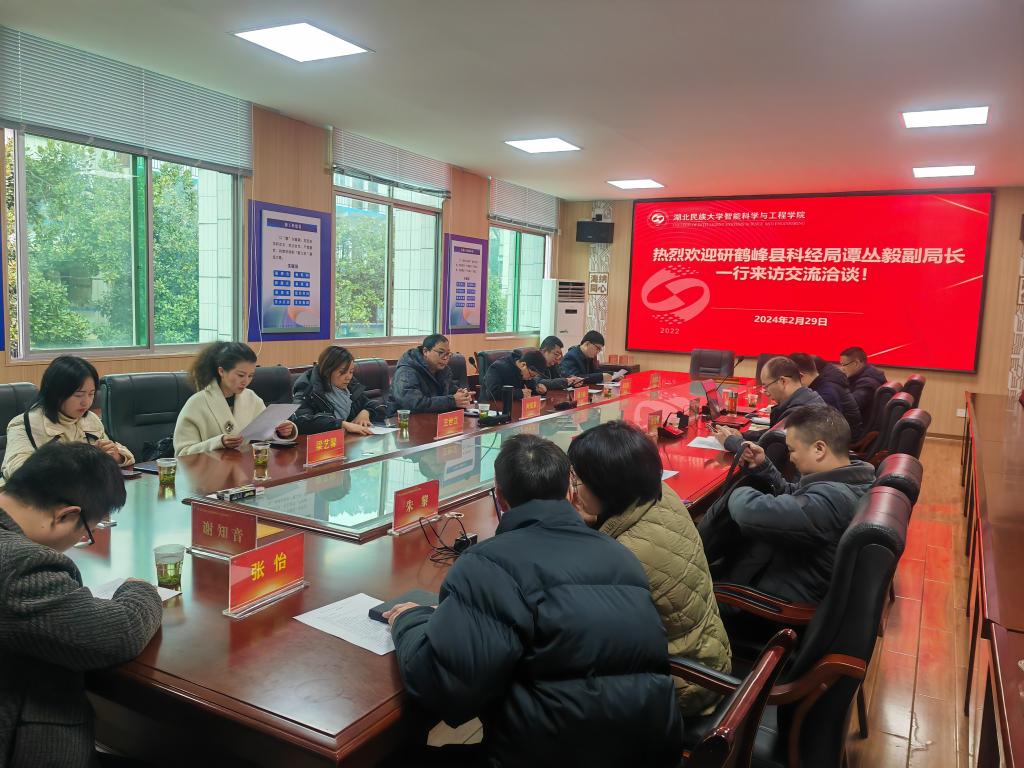2024年2月29日,鹤峰县科经局谭丛毅副局长一行来我院访问交流,主题为“深化校企合作,促进产教融合”。鹤峰县科经局副局长谭丛毅,鹤峰县科经局科技股股长谭泓波,鹤峰亚峰职校校长、众创空间平台负责人向成家,鹤峰县有机茶产业技术研究院营运公司财务负责人、中医药科创平台负责人王世立,恩施聚盛生物科技公司负责人、有机茶产业技术研究院运营公司运营负责人梁艺馨,鹤峰县施福春公司负责人李艳恒到访,我院党委书记孙先波、教务处副处长易金桥、我院副院长钱楷出席会议,我院教师廖红华、黄勇、胡涛、任达华、朱黎、谢知音、高林、张怡参加会议。会议由实验教学与创新实践中心主任朱黎主持。