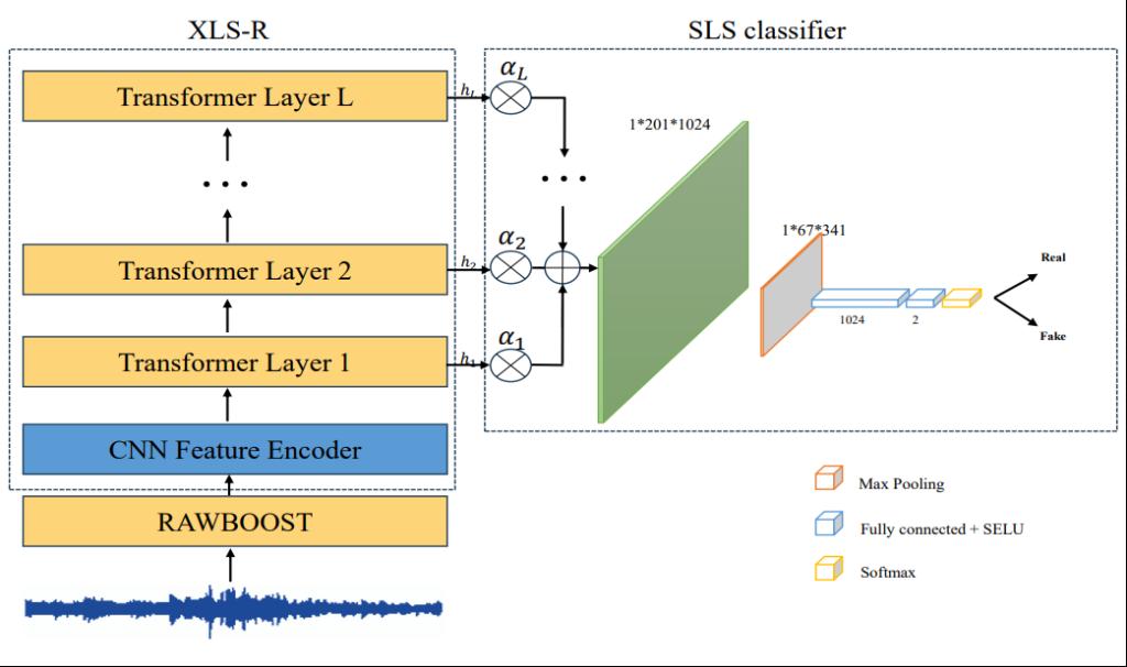 生成式人工智能技术,包括文本到语音(TTS)和语音转换(VC),经常与真实样本无法区分,这给个人区分真实和合成内容带来了挑战。这种不可区分性破坏了人们对媒体的信任,任意克隆个人语音信号对隐私和安全构成了重大挑战。在Deepfake音频检测领域,目前实现更高检测精度的大多数模型都采用自监督预训练模型。然而,随着Deepfake音频生成算法的不断发展,保持对新算法的高分辨精度变得越来越具有挑战性。为了提高Deepfake音频特征的灵敏度,项目组提出了一种包含SLS(敏感层选择)模块的Deepfake语音检测模型。具体来说,利用预训练的XLS-R使本模型能够从其各个层中提取不同的音频特征,每个层都提供不同的判别信息。利用SLS分类器,提出的模型能够捕获不同层次音频特征的敏感上下文信息,并有效地将这些信息用于伪音频检测。实验结果表明,本方法在ASVspoof 2021 DF和In the Wild数据集上都达到了最先进的(SOTA)性能,在ASVspoof 2021 DF数据集上的等错率(EER)为1.92%,在In the Wilds数据集上为7.46%。
