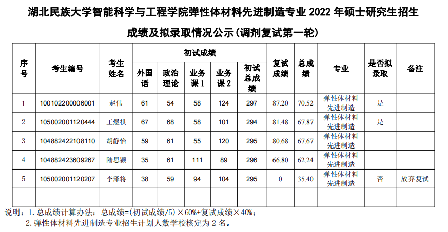 3044am永利集团3044noc智能科学与工程学院弹性体材料先进制造专业2022年硕士研究生招生 成绩及拟录取情况公示(调剂复试第一轮)