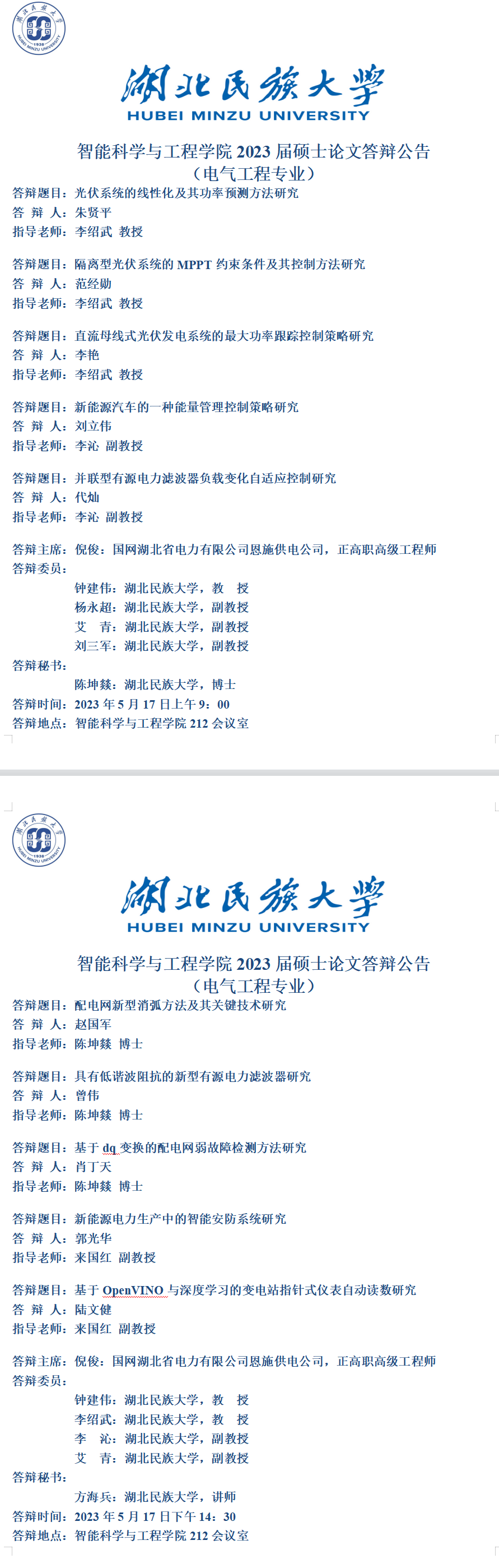 智能科学与工程学院2023届硕士学位论文答辩公告(一)