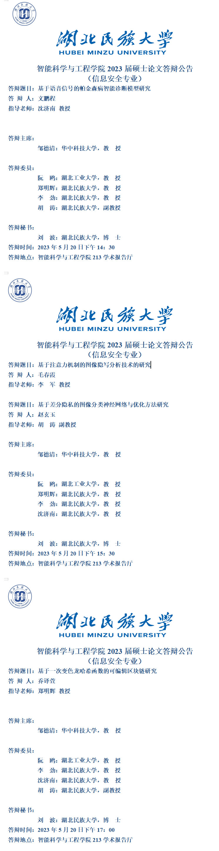 智能科学与工程学院2023届硕士学位论文答辩公告(六)