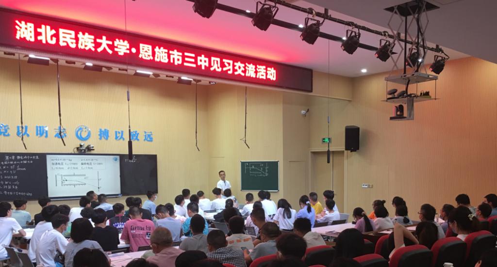 6月16日上午,学院组织物理学专业2019级学生前往恩施三中开展教育见习活动。本次活动由物理系物理学科教学团队左安友教授带队,物理系主任刘显明、支部书记蒋冰峰、专业教师杨春雷、朱瑜、翁祝林、张源、方仁洪及2019级物理学专业全体学生参加了活动。