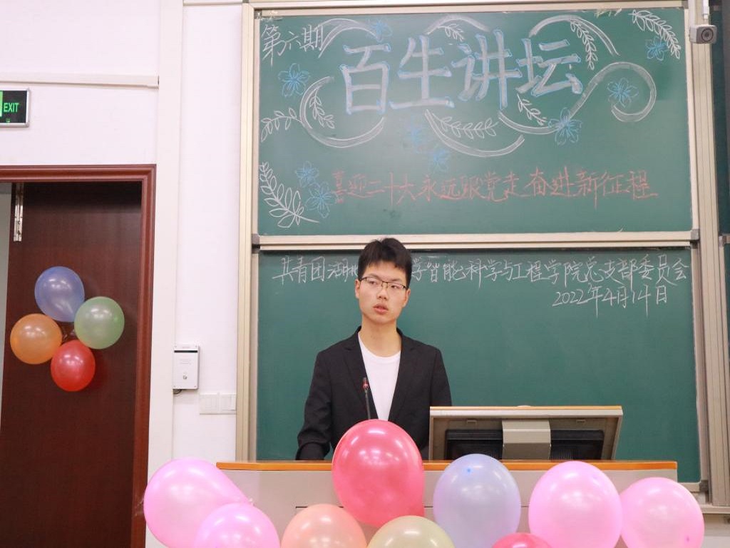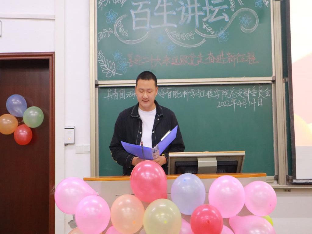 本网讯(记者 柯柏松 梅晨航/文 李明 万文杰/图)4月14日,为使广大青年深化理解习近平新时代中国特色社会主义理论思想,迎接党的二十大和庆祝建团一百周年,我院于修远楼5B410教室举办以理论学“习”我来讲——喜迎二十大、永远跟党走、奋进新征程为主题的第六期百生讲坛决赛活动。本次活动由我院团总支主办,我院团总支书记谭俊妮老师、副书记黄世成、李欣琪、田麟麒受邀出席本次活动并担任评委,亦有部分热情的学生观众前来参加此次活动。