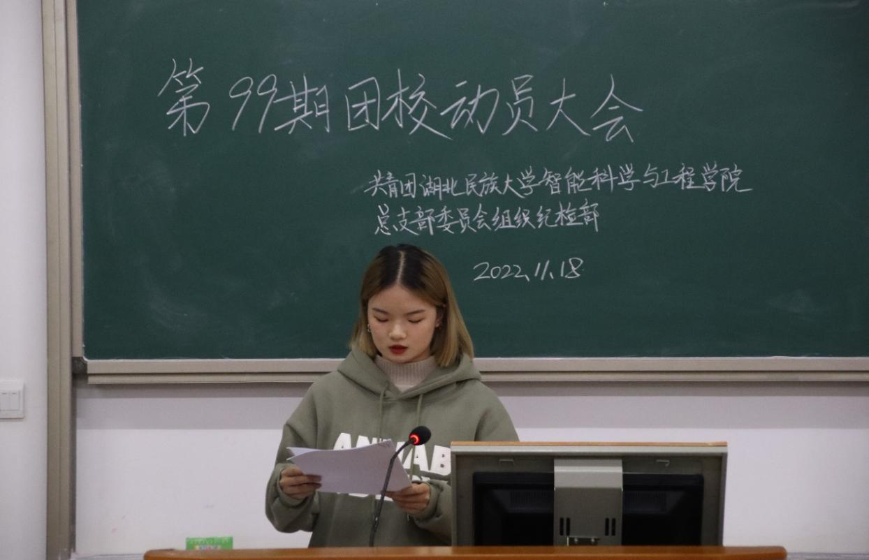 本网讯(记者 刘宇 贺林江 谭旭鸿/文 陈子聪/图 见习记者 覃意舟 田彬宇)11月18日晚,我院在修院楼5B502举办第99期团校动员大会。我院团总支副书记魏君亦、通过团校选拔考试的学员参加本次会议,大会由院团总支组纪部副部长胡谭佳主持。