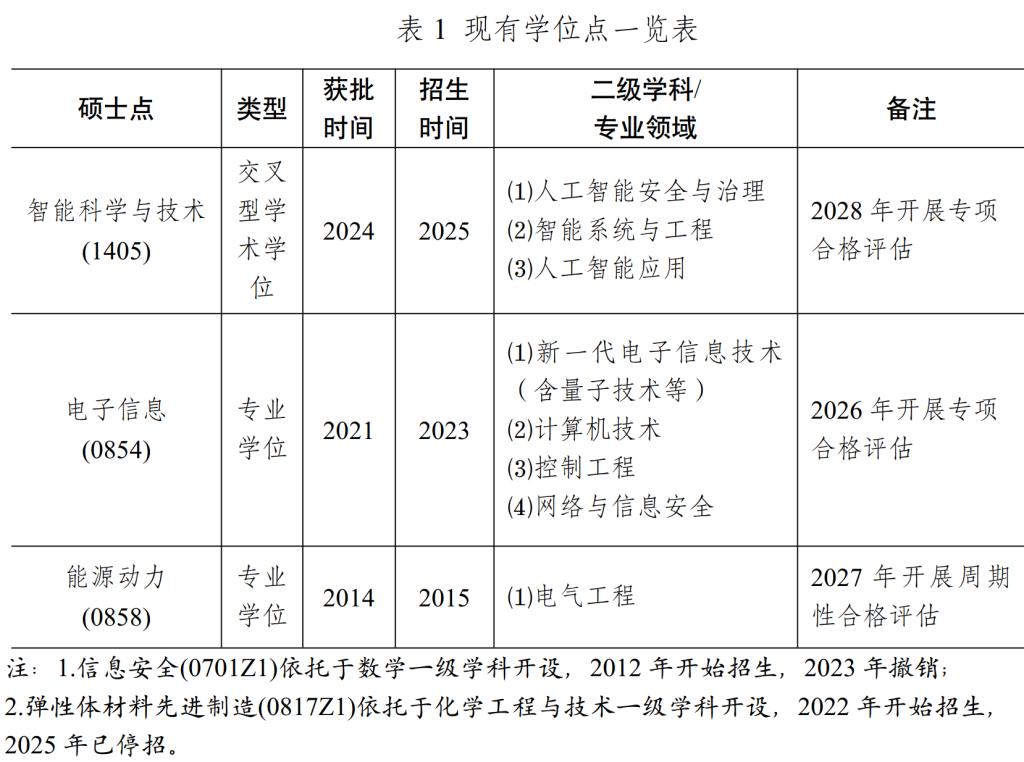 学院秉承智能+”的学科专业内涵建设理念,坚持校企合作、融合创新的新工科发展路径,积极适应地方经济社会发展需求和企业技术创新要求已初步构建完成以智能科学与技术学科为牵引,以电子信息和能源动力两个专业学位为技术支撑的多学科交叉融合发展的学科体系。现有学位点情况如表1所示。