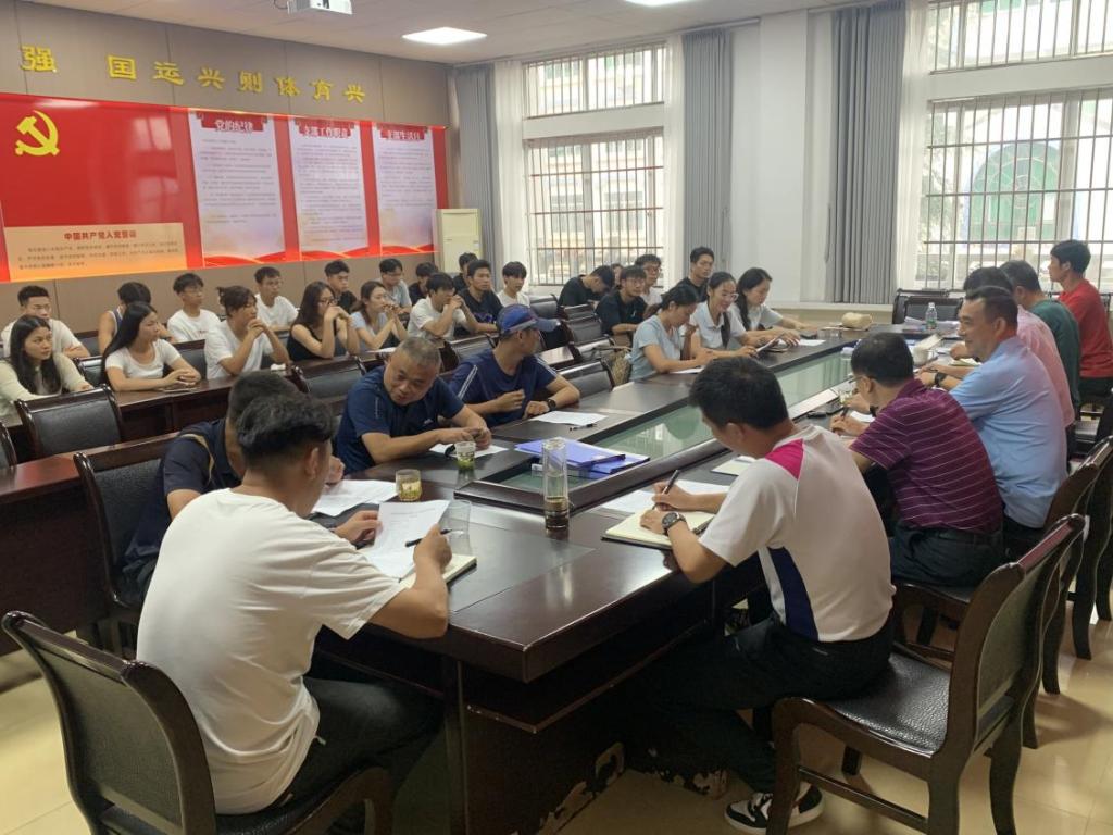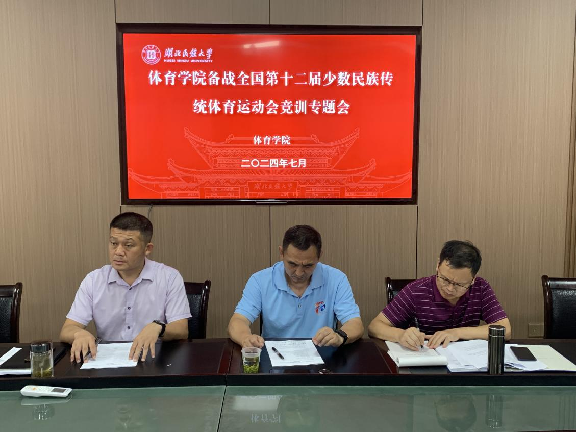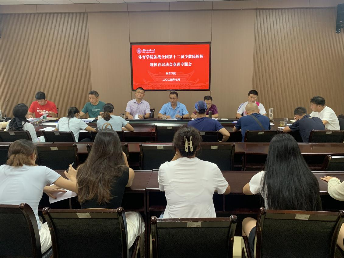 2024年7月4日,3044am永利集团3044noc体育学院在学院会议室召开全国第十二届少数民族传统体育运动会竞训专题会。会议由体育学院院长何斌主持,出席人员包括体育学院党总支书记赵魁轩湖北省备战全国民族运动会总教练(体育学院组织员)倪东业、副院长胡庆华书记万利、副院长张辉部分科室负责同志、民族传统体育全体教练员及运动员