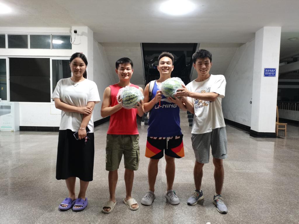 8月12日晚,体育学院党总支书记何斌、副院长胡庆华、副书记万利、院办副主任宋庆龙、学生科副科长张弋明一行,前往学生寝室看望备战湖北省第十届少数民族传统体育运动会的学生,并为他们送去20个冰西瓜,将夏日的一丝清凉带到了他们身边。