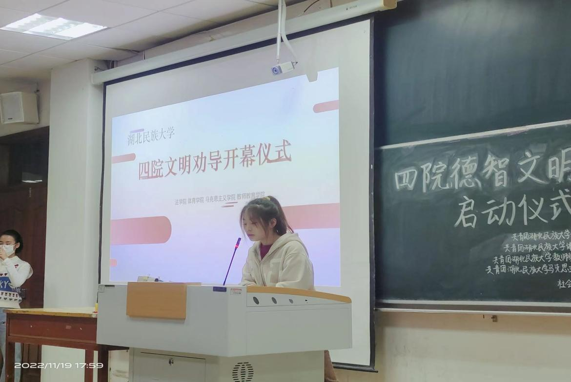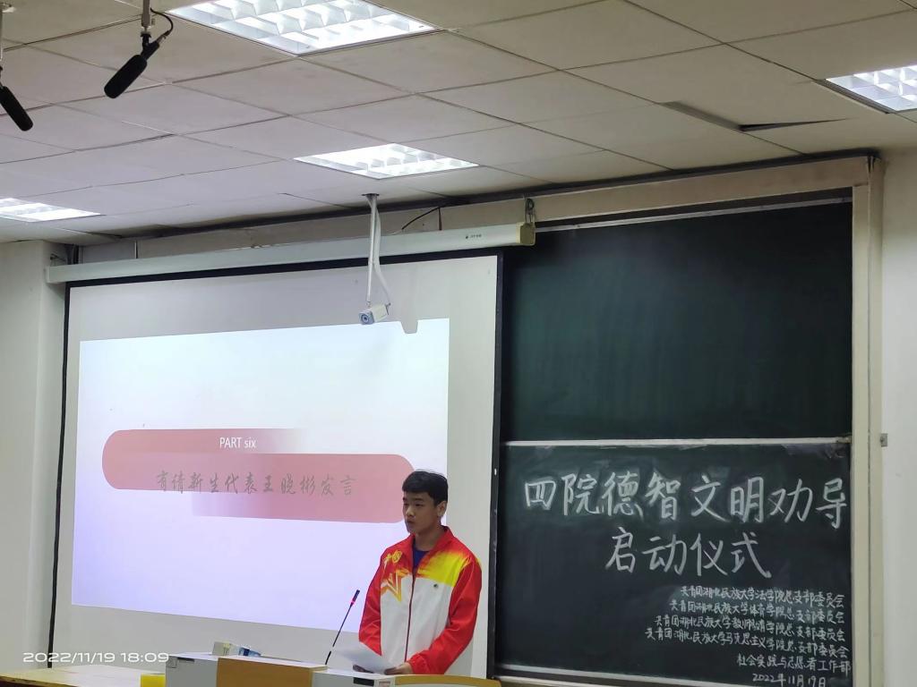 为弘扬“奉献、友爱、互助、进步”的志愿者精神,增强志愿者的服务意识、奉献意识,加强志愿者之间的工作交流,培养永利官网大学生卫生意识,构建良好的校容校貌和卫生环境。我院与法学院,马克思主义学院,教师教育学院于11月19日下午18:00在德智楼9B401教室联合开展德智文明劝导活动启动仪式。由四院全体青年志愿者参加本次活动。