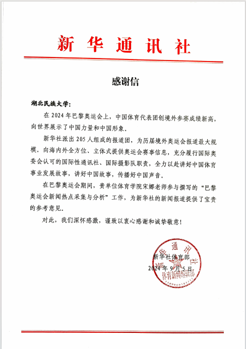 近日,3044am永利集团3044noc收到新华通讯社《感谢信》,旨在感谢体育学院宋娜老师在2024年巴黎奥运会上参与新闻热点采集与分析,以专业见解为体育代表团提供了重要参考,助力代表团在境外赛事中取得优异成绩。习近平总书记指出,2024年巴黎奥运会中国体育代表团的优异成绩,生动诠释了新时代中国精神,是广大运动员、教练员和体育工作者共同努力的完美答卷。
