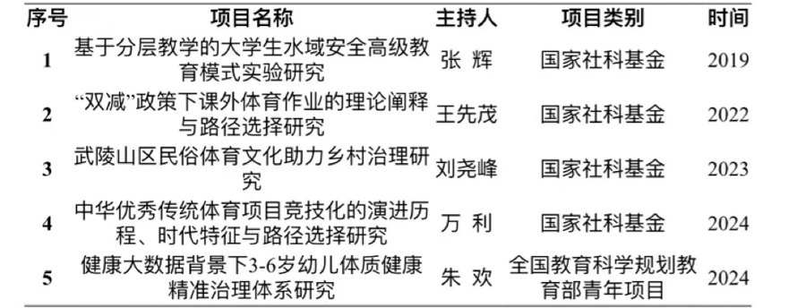 2022年王先茂主持的“‘双减’政策下课外体育作业的理论阐释与路径选择研究”,2023年刘尧峰主持的“武陵山区民俗体育文化助力乡村治理研究”,2024年万利主持的“中华优秀传统体育项目竞技化的演进历程、时代特征与路径选择研究”、朱欢主持的 “健康大数据背景下3-6岁幼儿体质健康精准治理体系研究”等获得国家社科基金和全国教育科学规划教育部青年项目立项。