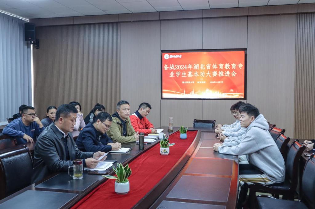 2024年全省高校体育教育专业学生基本功大赛将于12月5日—8日在江汉大学举行,为了提高同学们的思想认知,增强比赛备战的热烈氛围,11月7日上午,我院在会议室召开“备战2024年湖北省体育教育专业学生基本功大赛推进会”,院党总支书记赵魁轩、院长何斌、副院长胡庆华、张辉以及全体指导老师、备赛学生参加会议,
