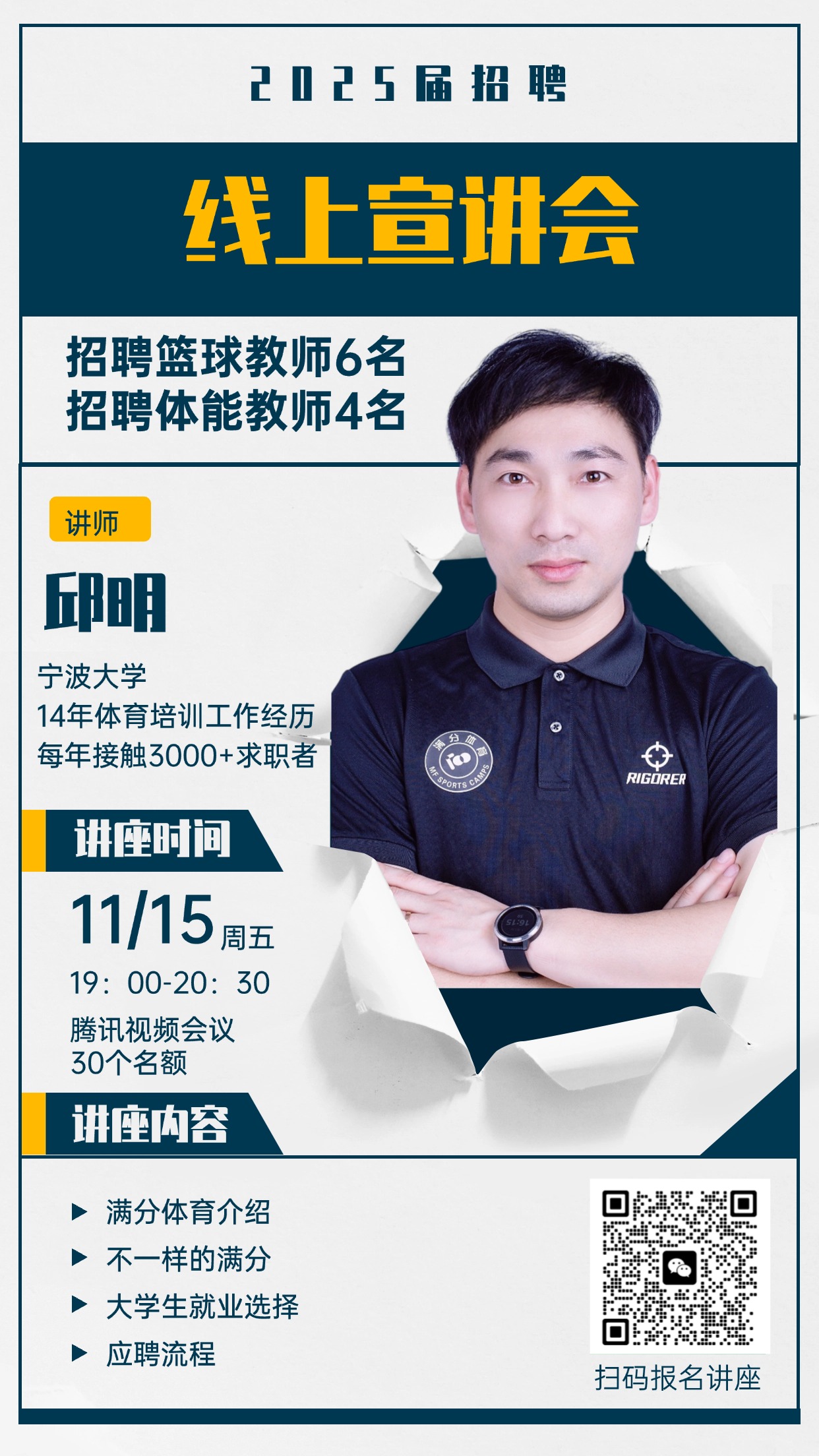 11月12日,浙江宁波满分体育来院举行线上专场招聘会,体育学院2025届毕业生近30人参加了此次招聘会。此次招聘会由宁波满分体育人力资源总监邱明主持,也是满分体育第二次来院招聘。