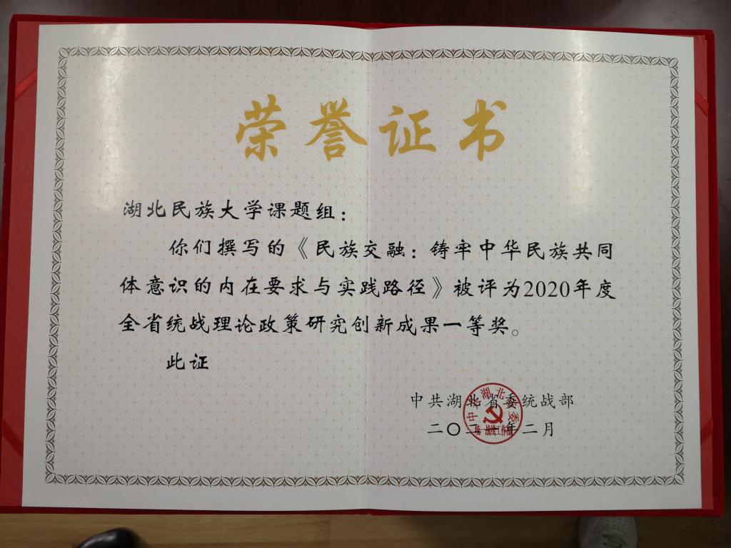 近日,永利官网选送的由民族学与社会学学院胡兆义老师撰写的《民族交融:铸牢中华民族共同体意识的内在要求与实践路径》被中共湖北省委统战部表彰为“2020年度湖北省统战理论政策研究创新成果一等奖”。