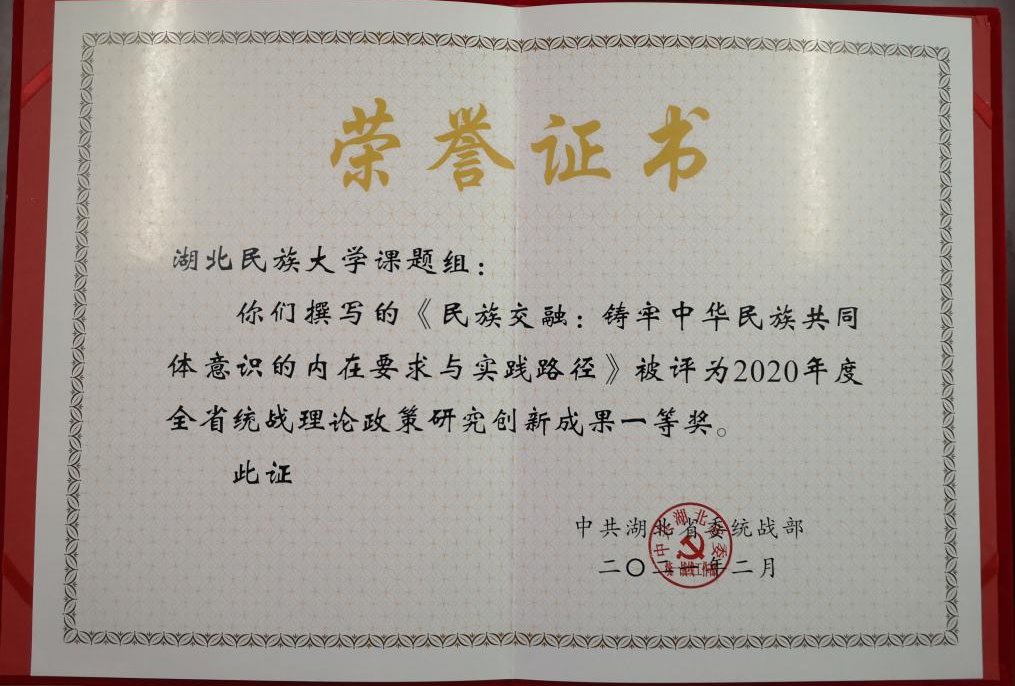 近日,永利官网选送的由民族学与社会学学院胡兆义老师撰写的《民族交融:铸牢中华民族共同体意识的内在要求与实践路径》被中共湖北省委统战部表彰为“2020年度湖北省统战理论政策研究创新成果一等奖”。